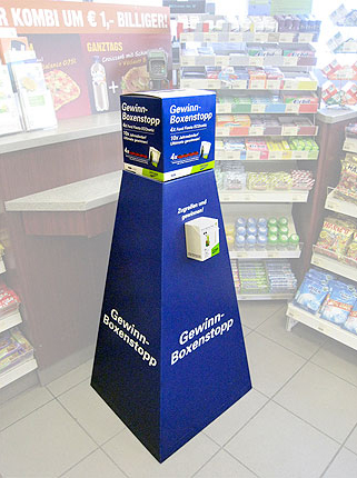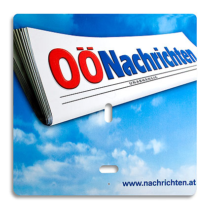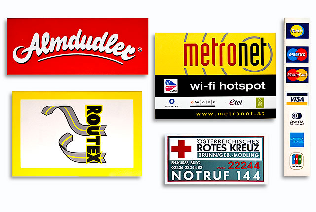 Aufkleber, Bautafeln, Deckenhänger, Dispenser, Displays, Durchleuchtschilder, Etiketten, Fahnen, Figuraufsteller, Fußbodenkleber, Gießharzschilder, Hinterglaskleber, Mousepads, Plakate, Regalstopper, Tischaufsteller, Transparente, Visitenkarten, Zeitungsdisplays u.v.m.